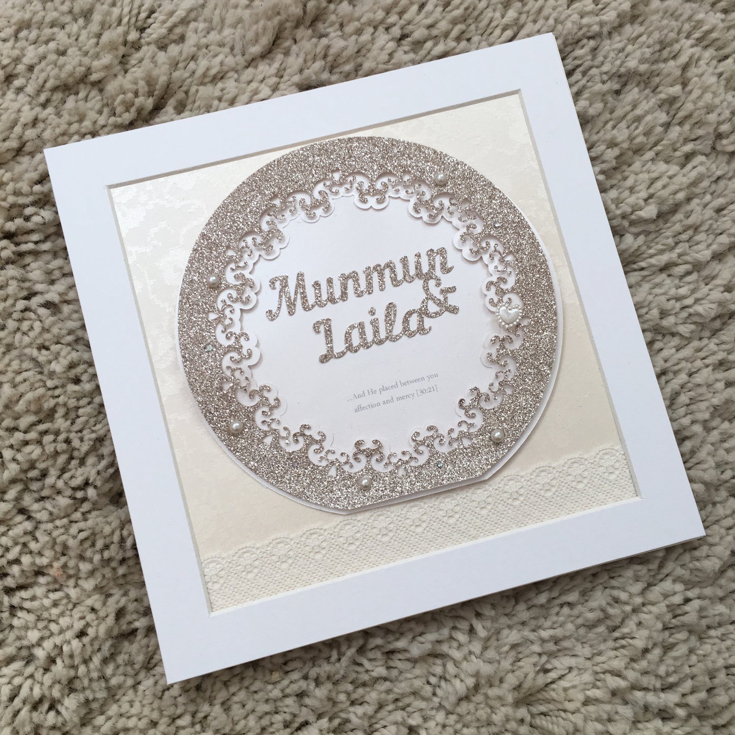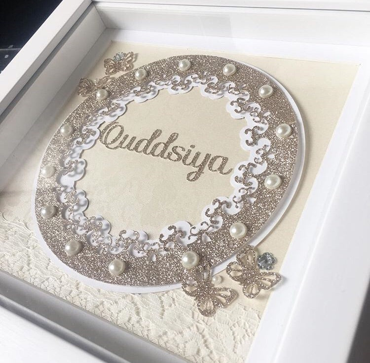 A lovely hand-crafted frame. Embellished with lush champagne gold glitter card stock and pearls.