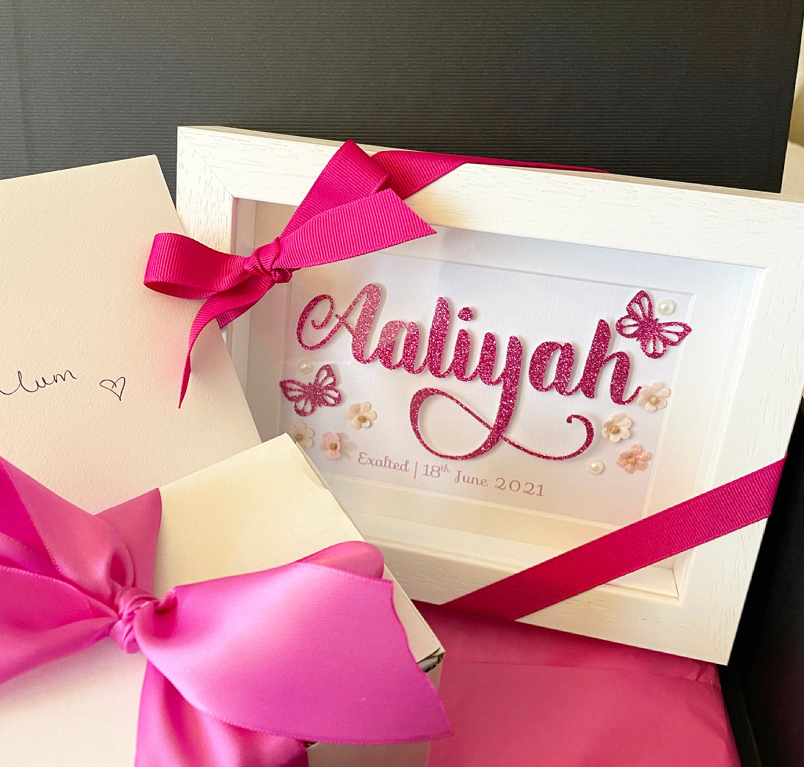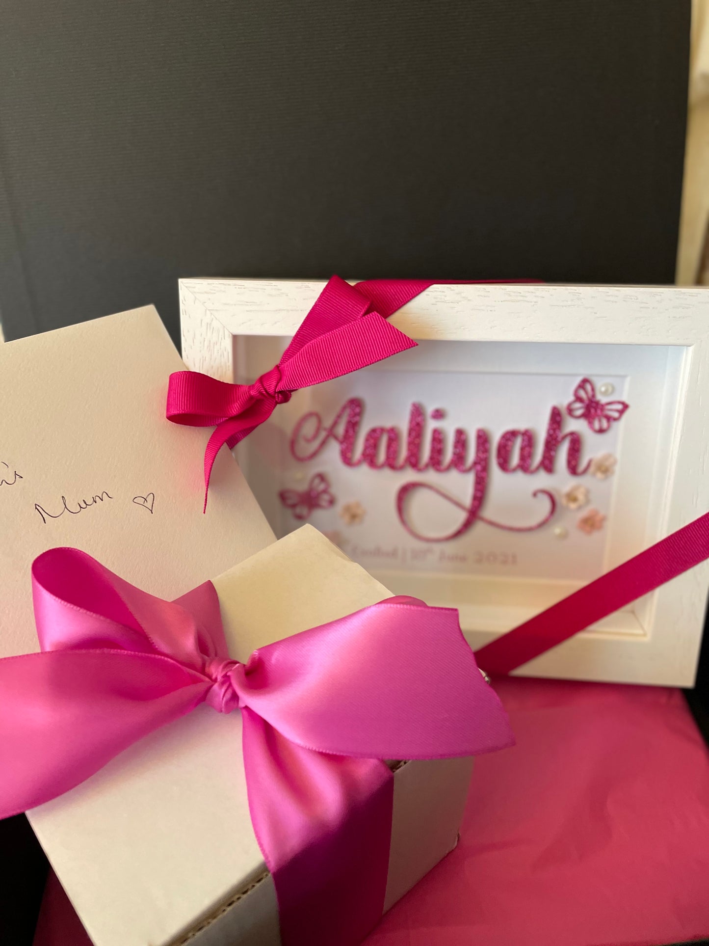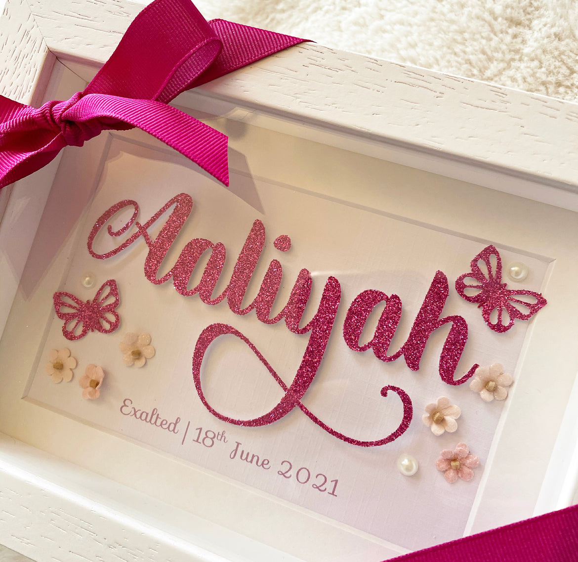 A lovely handcrafted personalized name frame with meaning. Embellished with glitter card stock, adhesive pearls, butterflies and cute little buttons. The name is made from glitter cardstock which is placed on foam pads to create a 3d effect. The meaning of the name is printed below.