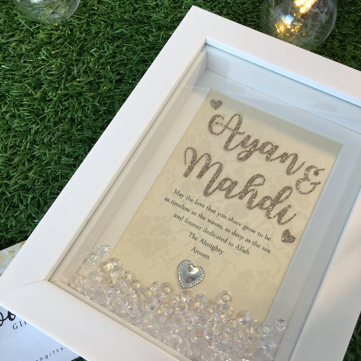 A lovely handcrafted personalized wedding frame. Embellished with glitter card stock and adhesive pearls. A short message of your choice can be added below the couples name.
