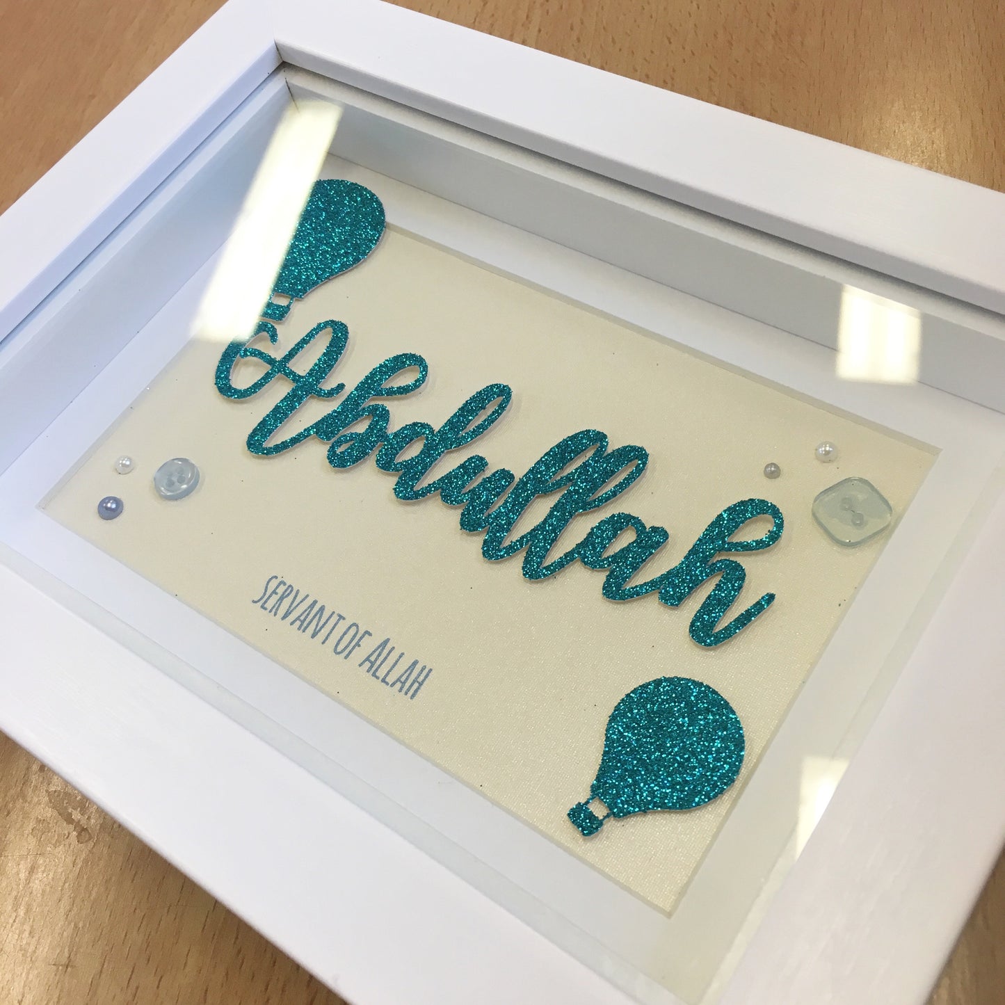 A personalized name box frame embellished with glitter cardstock, cars and cute little buttons. The name is made from glitter cardstock which is placed on foam pads to create a 3d effect